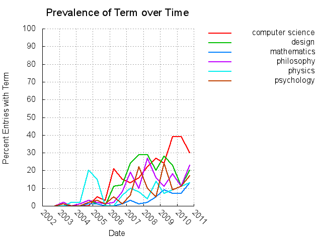 Here's another one, on academic topics. These were all topics I considered studying in college. I eventually majored in computer science and got a certificate in engineering design, but took extra classes in all these subjects. I think it's neat that these topics has all been mentioned more often over time - that I'm still into the same subjects I was in high school and college... except design, which I haven't done any of since junior year.